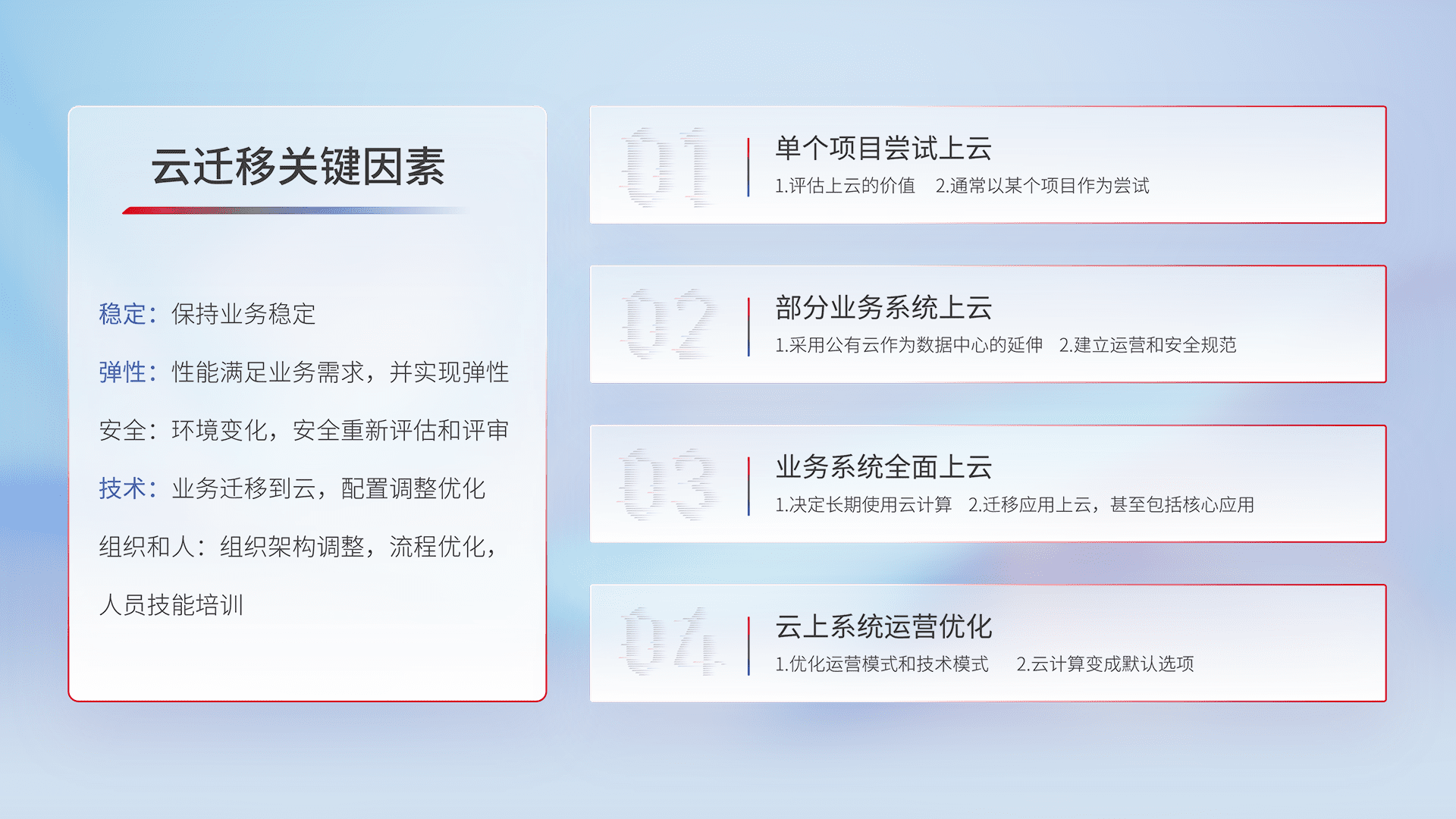 结合实际业务,,,,从规划设计、、、、云平台选型、、、云原生改造、、数据迁移、、集成交付,,,,迁移全过程为客户识别最佳上云路径,,,,做好风险识别管理,,,设计网络架构、、、身份权限、、、、安全审计合规、、、、操作审计、、、日志审计、、、监控告警策略、、多站点容灾设计等,,对云上基础设施进行整体规划,,,提升IT治理水平,,,,以满足弹性、、高可用、、、、高性能的需求。。